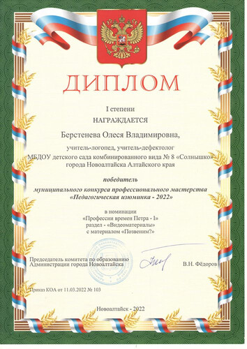 Главная | Наша жизнь | Фотогалерея | Берстенева Олеся Владимировна | Мои достижения | 2022г. Диплом
