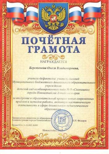 Главная | Наша жизнь | Фотогалерея | Берстенева Олеся Владимировна | Мои достижения | 2023г. Почетная грамота