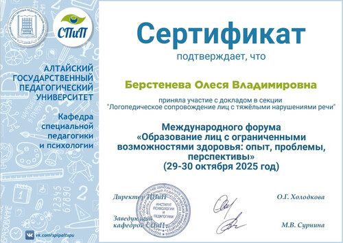 Главная | Наша жизнь | Фотогалерея | Берстенева Олеся Владимировна | Мои достижения | 2025г Сертификат