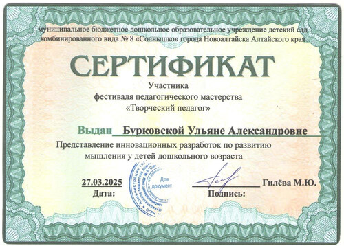 Главная | Наша жизнь | Фотогалерея | Бурковская Ульяна Александровна | Мои достижения | Сертификат участника Творческий педагог 2025г.