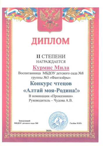 Главная | Наша жизнь | Фотогалерея | Чудова Анастасия Викторовна | Достижения детей | 2025г. Курмис М.