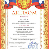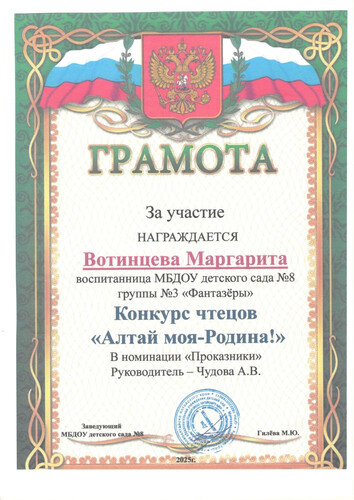 Главная | Наша жизнь | Фотогалерея | Чудова Анастасия Викторовна | Достижения детей | 2025г. Вотинцева М.