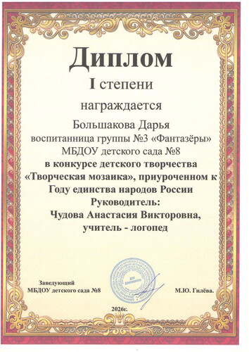 Главная | Наша жизнь | Фотогалерея | Чудова Анастасия Викторовна | Достижения детей | Большакова Д., рук Чудова