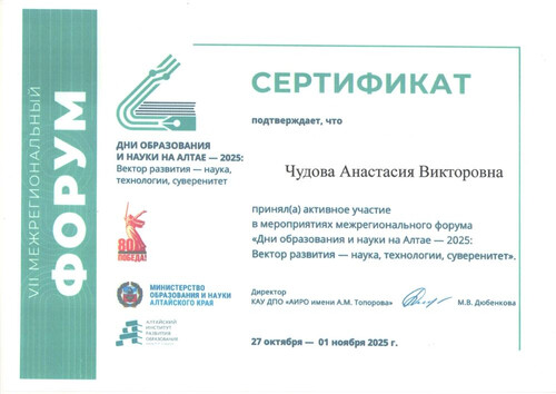 Главная | Наша жизнь | Фотогалерея | Чудова Анастасия Викторовна | Мои достижения | 2025г Сертификат
