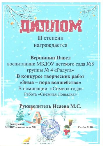 Главная | Наша жизнь | Фотогалерея | Исаева Марина Сергеевна | Достижения детей | 2026г, диплом Вершинин П., Исаева М.С.