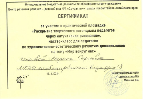 Главная | Наша жизнь | Фотогалерея | Исаева Марина Сергеевна | Мои достижения | 2023г. Исаева Сертификат