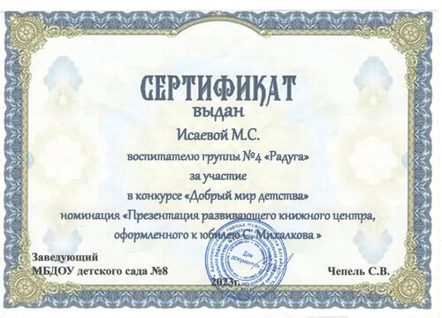 Главная | Наша жизнь | Фотогалерея | Исаева Марина Сергеевна | Мои достижения | 2023г.Сертификат