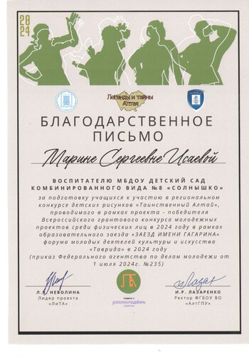 Главная | Наша жизнь | Фотогалерея | Исаева Марина Сергеевна | Мои достижения | 2024г. Благодарственное письмо
