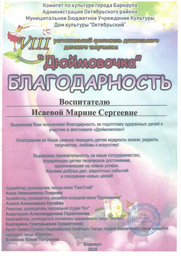 Главная | Наша жизнь | Фотогалерея | Исаева Марина Сергеевна | Мои достижения | 2025г. Благодарность