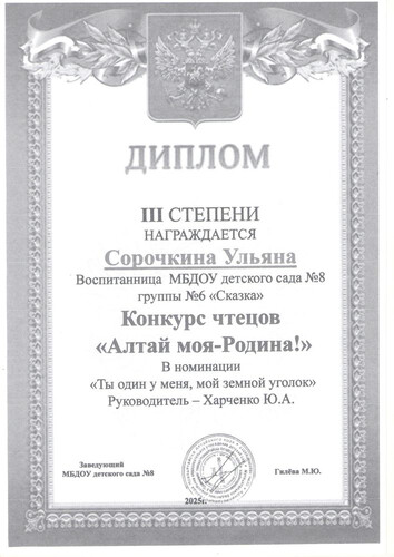 Главная | Наша жизнь | Фотогалерея | Харченко Юлия Александровна | Достижения детей | 2025г. Сорочкина У. (2)