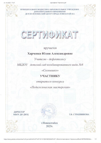 Главная | Наша жизнь | Фотогалерея | Харченко Юлия Александровна | Мои достижения | 2025г. Сертификат