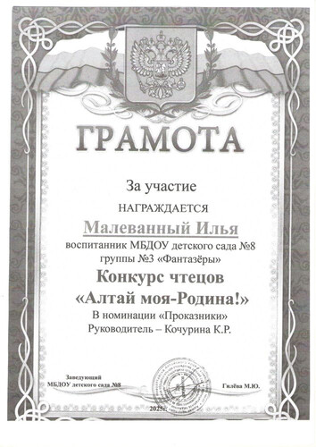 Главная | Наша жизнь | Фотогалерея | Кочурина Ксения Романовна | Достижения детей | 2025г. Малеванный И