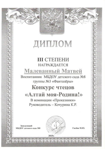 Главная | Наша жизнь | Фотогалерея | Кочурина Ксения Романовна | Достижения детей | 2025г. Малеванный М.