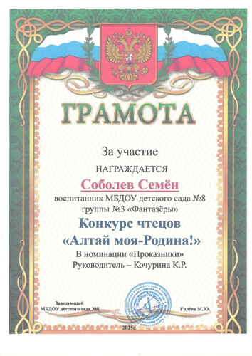 Главная | Наша жизнь | Фотогалерея | Кочурина Ксения Романовна | Достижения детей | 2025г. Соболев С.