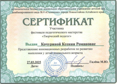 Главная | Наша жизнь | Фотогалерея | Кочурина Ксения Романовна | Мои достижения | 2025г. Сертификат участника