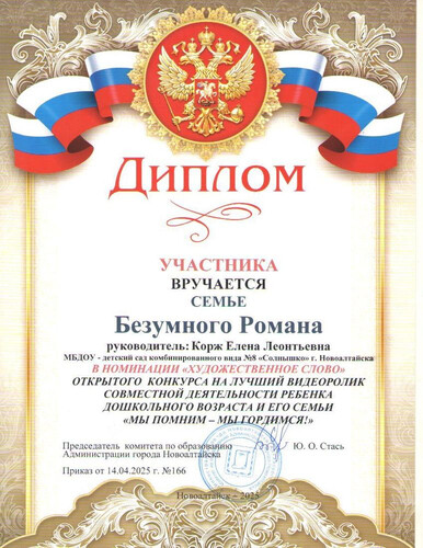 Главная | Наша жизнь | Фотогалерея | Корж Елена Леонтьевна | Достижения детей | 2025г. Безумнов Роман