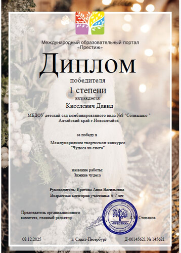 Главная | Наша жизнь | Фотогалерея | Кротова Анна Васильевна | Достижения детей | Киселевич Д.