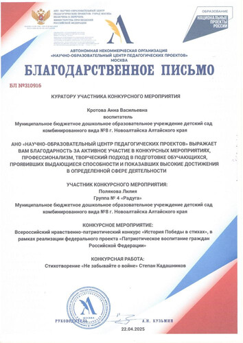 Главная | Наша жизнь | Фотогалерея | Кротова Анна Васильевна | Мои достижения | Благодарственное письмо 2025г.