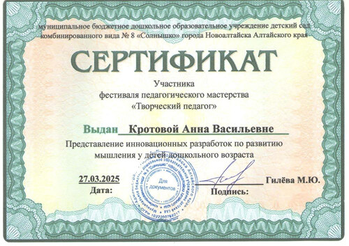 Главная | Наша жизнь | Фотогалерея | Кротова Анна Васильевна | Мои достижения | Сертификат Творческий педагог 2025г.