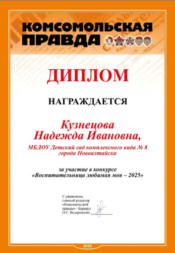 Главная | Наша жизнь | Фотогалерея | Кузнецова Надежда Ивановна | Мои достижения | 2025г. Диплом
