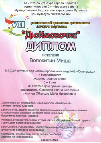 Главная | Наша жизнь | Фотогалерея | Обгаидзе Мая Николаевна | Достижения детей | Волокит М. Обгаидзе МН, Сазонова ЕС