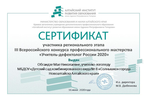 Главная | Наша жизнь | Фотогалерея | Обгаидзе Мая Николаевна | Мои достижения | 2020г. Сертификат