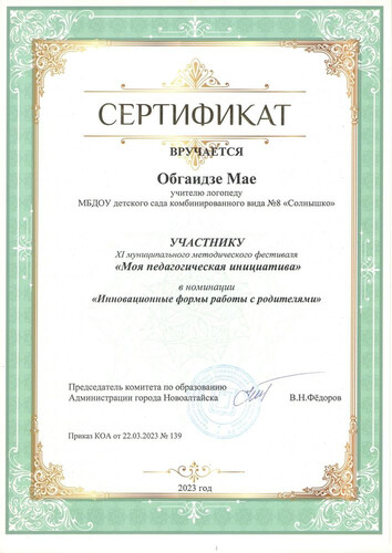 Главная | Наша жизнь | Фотогалерея | Обгаидзе Мая Николаевна | Мои достижения | 2023г. Сертификат Обгаидзе МН