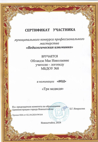 Главная | Наша жизнь | Фотогалерея | Обгаидзе Мая Николаевна | Мои достижения | 2024г. Сертификат