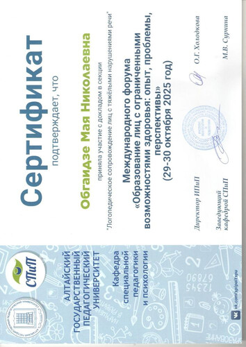 Главная | Наша жизнь | Фотогалерея | Обгаидзе Мая Николаевна | Мои достижения | 2025г. Сертификат