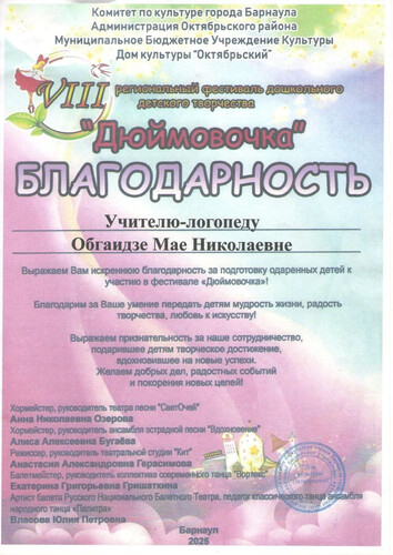 Главная | Наша жизнь | Фотогалерея | Обгаидзе Мая Николаевна | Мои достижения | Благодарность Обгаидзе МН