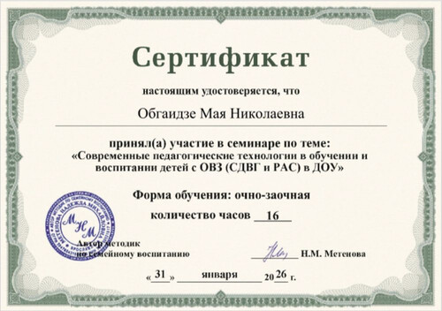 Главная | Наша жизнь | Фотогалерея | Обгаидзе Мая Николаевна | Мои достижения | Сертификат, Обгаидзе М.Н.
