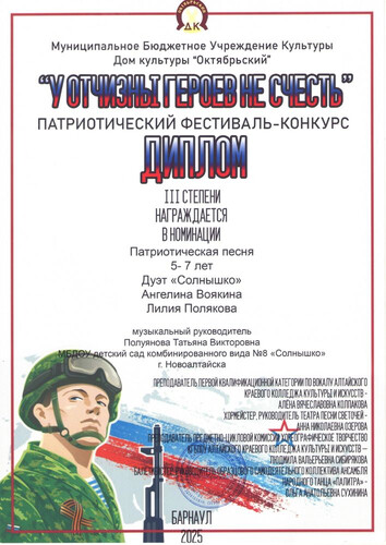 Главная | Наша жизнь | Фотогалерея | Полуянова Татьяна Викторовна | Достижения детей | Дуэт Солнышко Полуянова ТВ