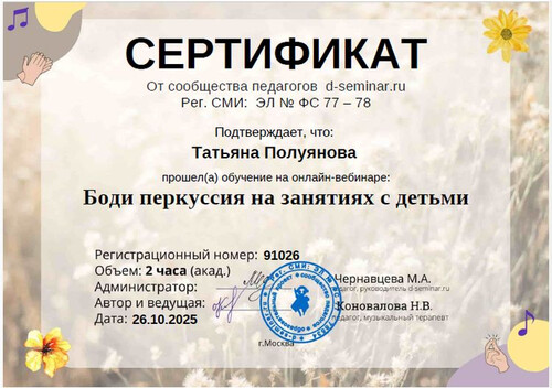 Главная | Наша жизнь | Фотогалерея | Полуянова Татьяна Викторовна | Мои достижения | 2025г Сертификат Полуянова