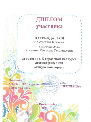 Главная | Наша жизнь | Фотогалерея | Русанова Светлана Геннадьевна | Достижения детей | 2025г. Крехова Влада