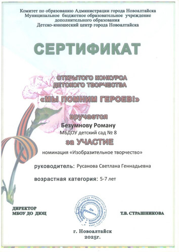 Главная | Наша жизнь | Фотогалерея | Русанова Светлана Геннадьевна | Достижения детей | Безумнов Р. Русанова СГ