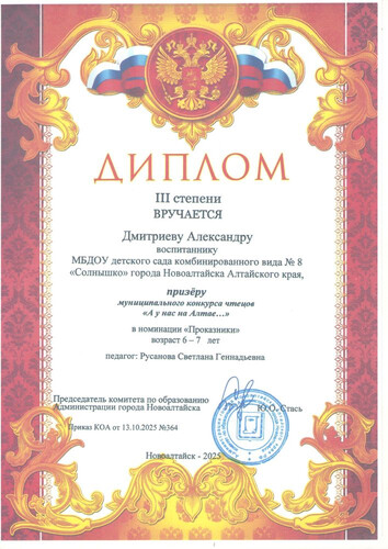 Главная | Наша жизнь | Фотогалерея | Русанова Светлана Геннадьевна | Достижения детей | Дмитриев А. Русанова СГ