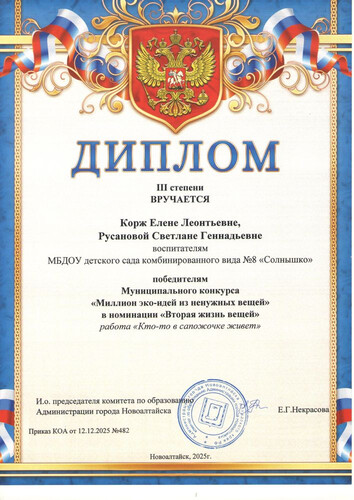 Главная | Наша жизнь | Фотогалерея | Русанова Светлана Геннадьевна | Мои достижения | 2025г. Диплом 3