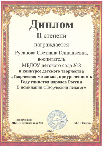 Главная | Наша жизнь | Фотогалерея | Русанова Светлана Геннадьевна | Мои достижения | Русанова С.Г.