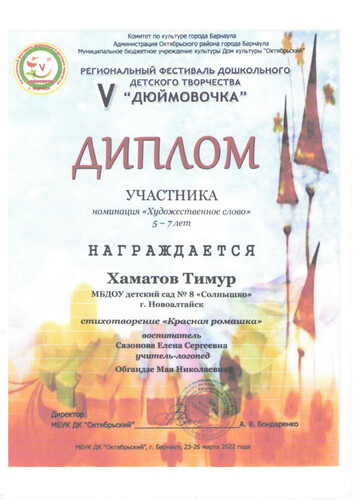 Главная | Наша жизнь | Фотогалерея | Сазонова Елена Сергеевна | Достижения детей | 2022г. Хаматов Т. Обгаидзе МН, Сазонова ЕС