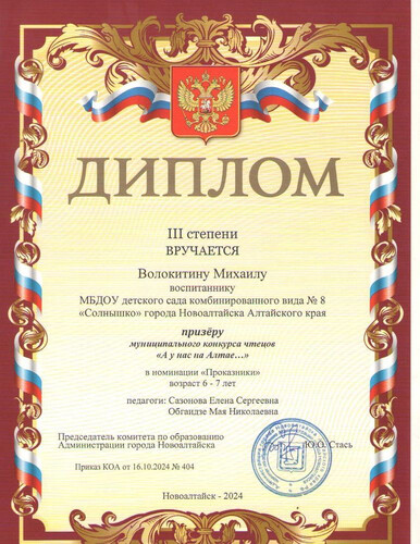 Главная | Наша жизнь | Фотогалерея | Сазонова Елена Сергеевна | Достижения детей | 2024г. Волокитин М.