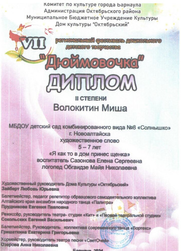 Главная | Наша жизнь | Фотогалерея | Сазонова Елена Сергеевна | Достижения детей | 2024г. Волокитин М. Обгаидзе МН, Сазонова ЕС