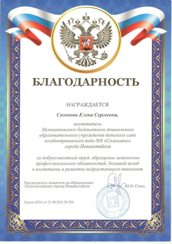 Главная | Наша жизнь | Фотогалерея | Сазонова Елена Сергеевна | Мои достижения | Благодарность Сазонова ЕС