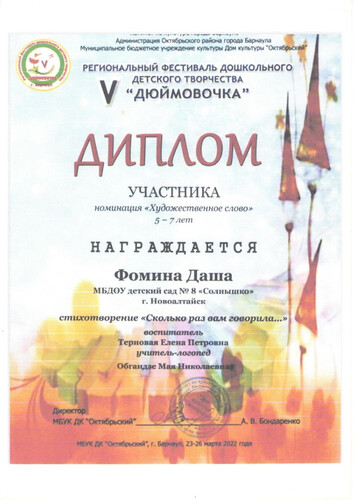 Главная | Наша жизнь | Фотогалерея | Терновая Алена Петровна | Достижения детей | 2022г. Фомина Д. Обгаидзе МН, Терновая ЕП
