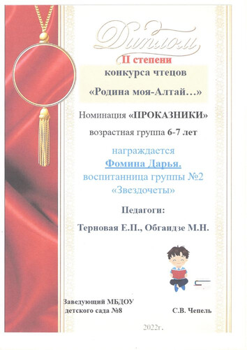 Главная | Наша жизнь | Фотогалерея | Терновая Алена Петровна | Достижения детей | 2022г. Фомина Д. Терновая ЕП Обгаидзе МН
