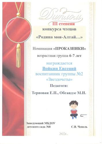 Главная | Наша жизнь | Фотогалерея | Терновая Алена Петровна | Достижения детей | 2022г. Войкин Е. Обгаидзе МН, Терновая ЕП