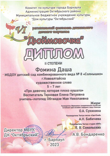 Главная | Наша жизнь | Фотогалерея | Терновая Алена Петровна | Достижения детей | 2023г. Фомина Д. Обгаидзе МН, Терновая ЕП