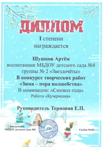 Главная | Наша жизнь | Фотогалерея | Терновая Алена Петровна | Достижения детей | 2026г, Диплом., Шушков А., Терновая Е.П.