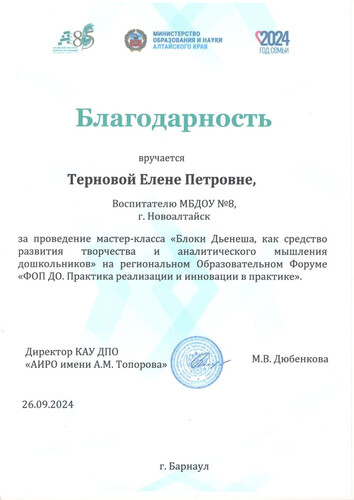 Главная | Наша жизнь | Фотогалерея | Терновая Алена Петровна | Мои достижения | 2024г. Благодарность