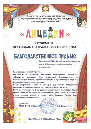 Главная | Наша жизнь | Фотогалерея | Терновая Алена Петровна | Мои достижения | Благодарственное Письмо Терновая ЕП