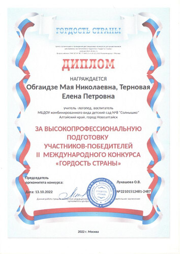 Главная | Наша жизнь | Фотогалерея | Терновая Алена Петровна | Мои достижения | Диплом Обгаидзе МН, Терновая ЕП